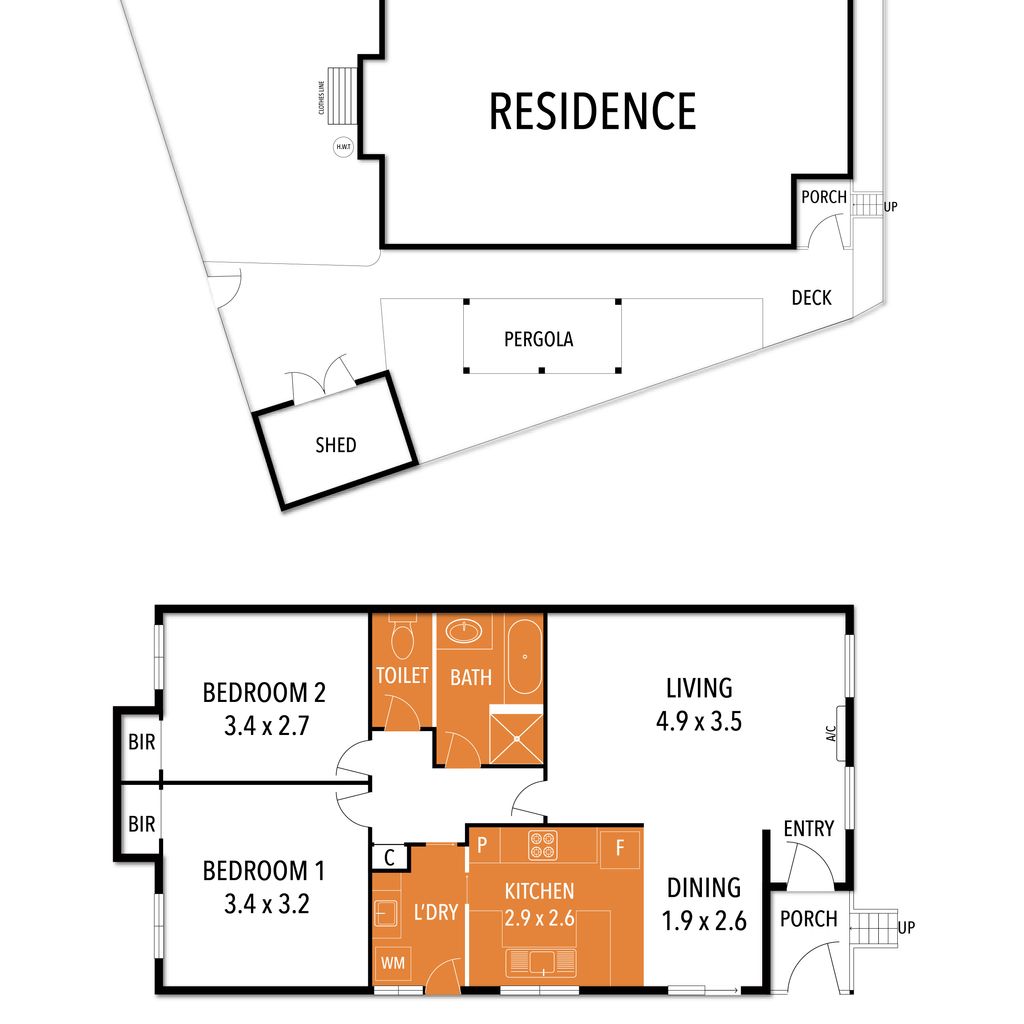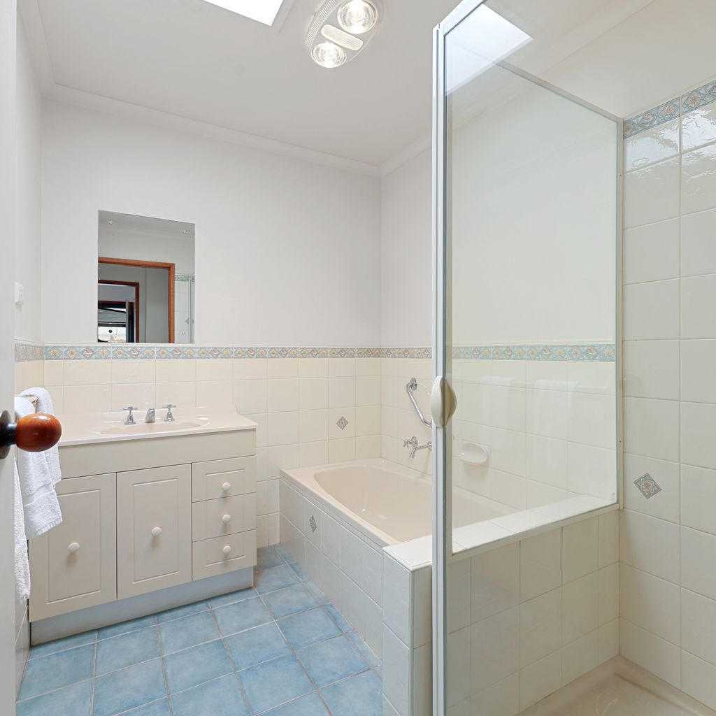 Both spacious bedrooms contain queen beds and built in robes. The main bathroom includes a separate bath and walk in shower, and there is an additional powder room with toilet.