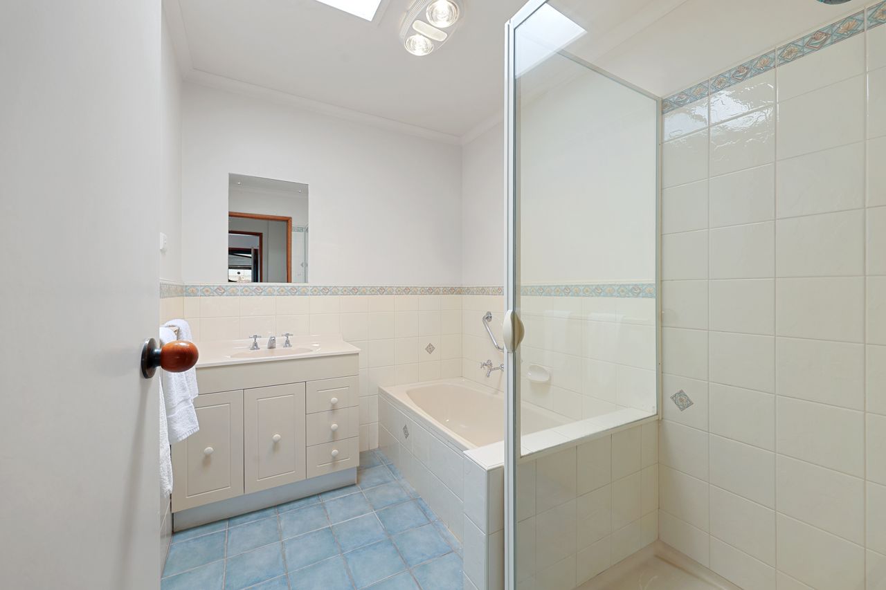 Both spacious bedrooms contain queen beds and built in robes. The main bathroom includes a separate bath and walk in shower, and there is an additional powder room with toilet.