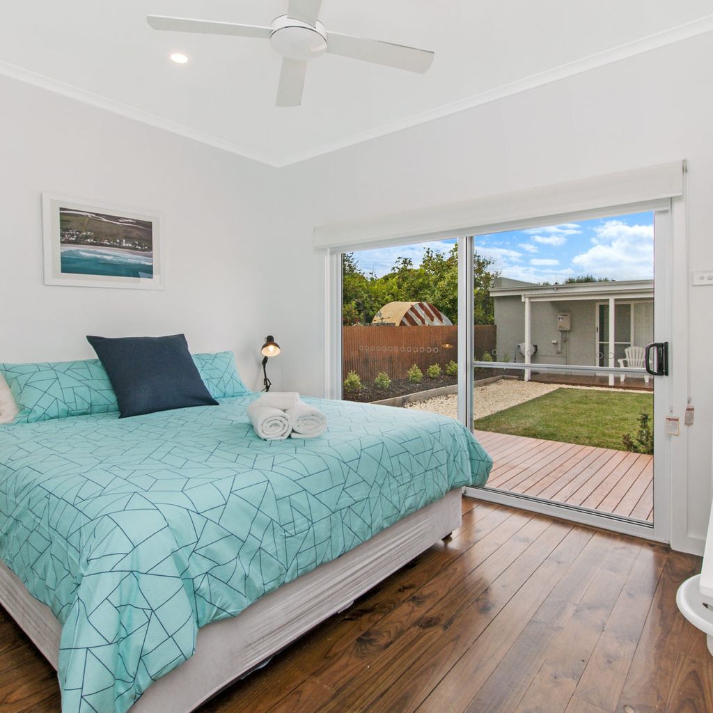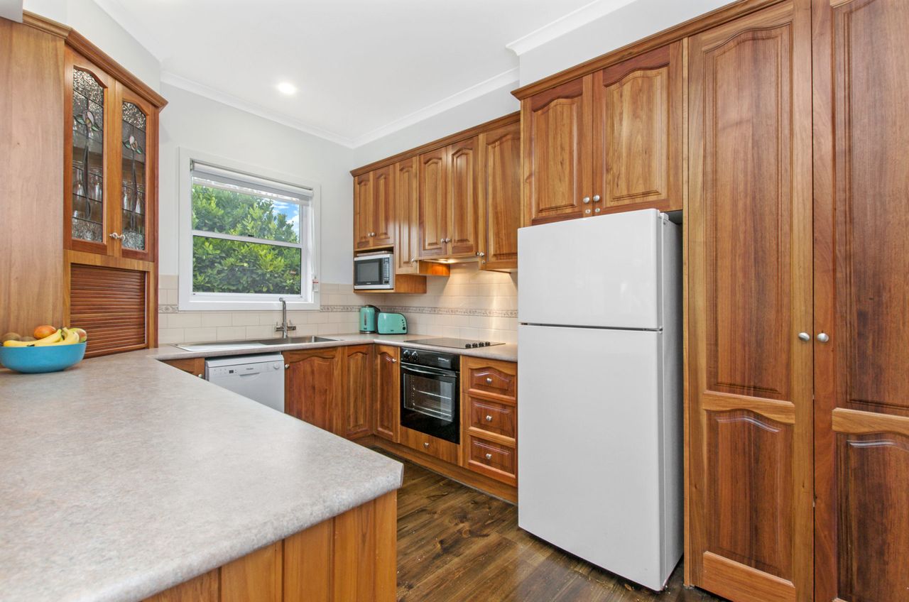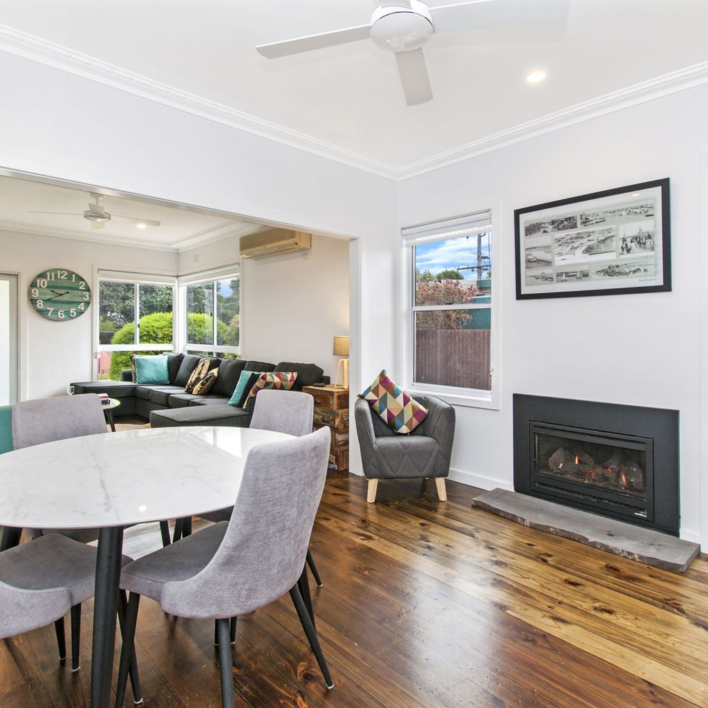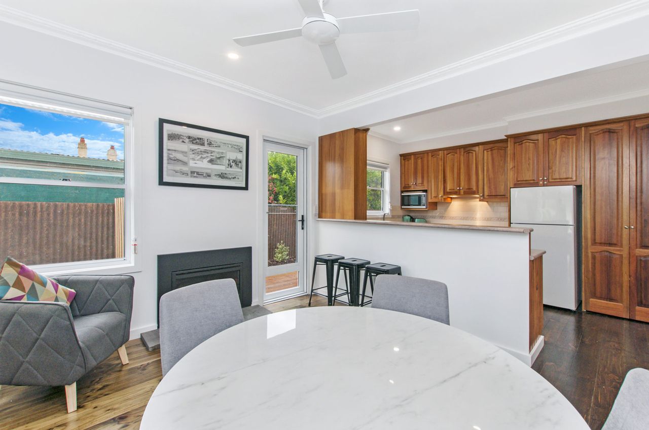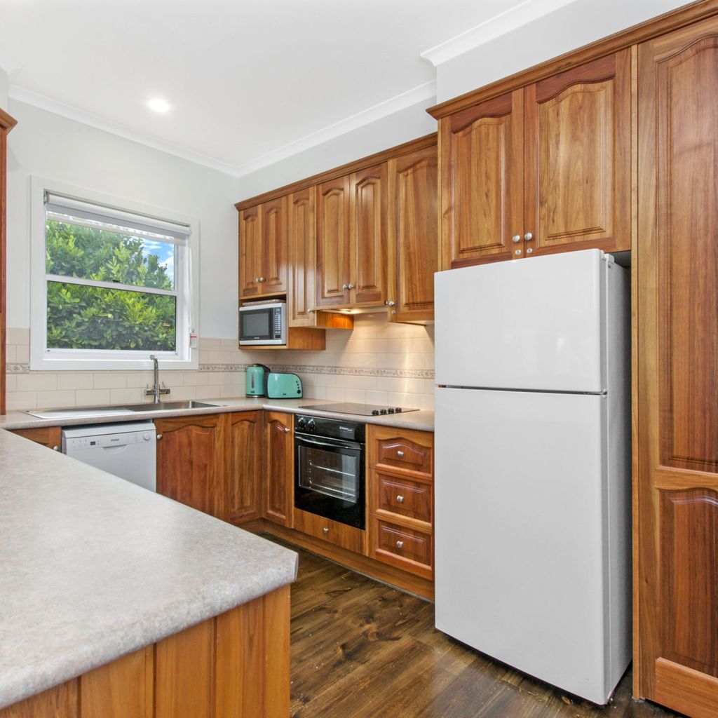 The main living with split system provides a relaxing space after a busy day at the beach and is open plan into the kitchen with gas log fire keeping you toasty in winter. The kitchen has everything you could need for your time away. There is also a filtered rain water tap in the kitchen for anyone not enjoying the unique Port Fairy water taste.