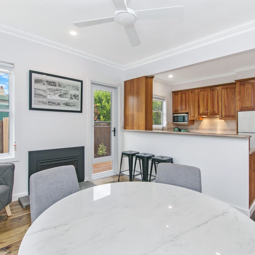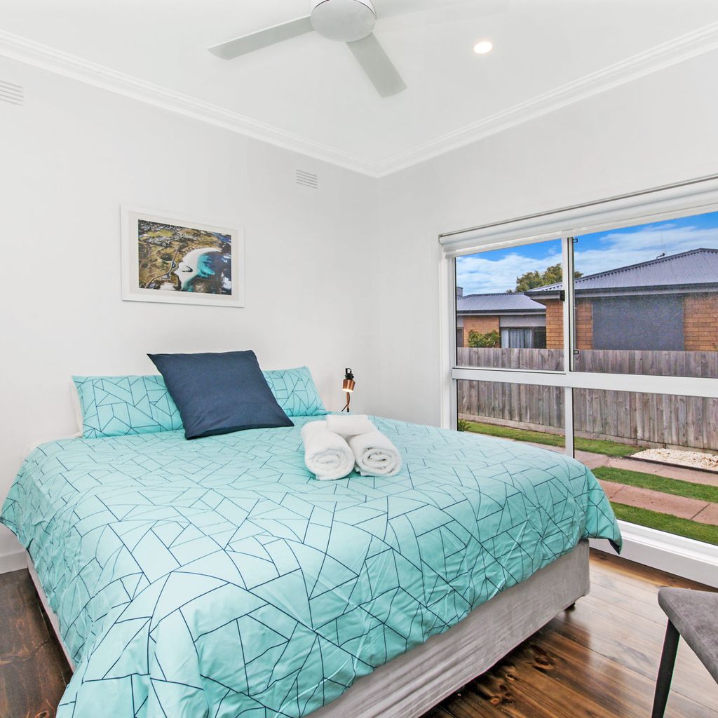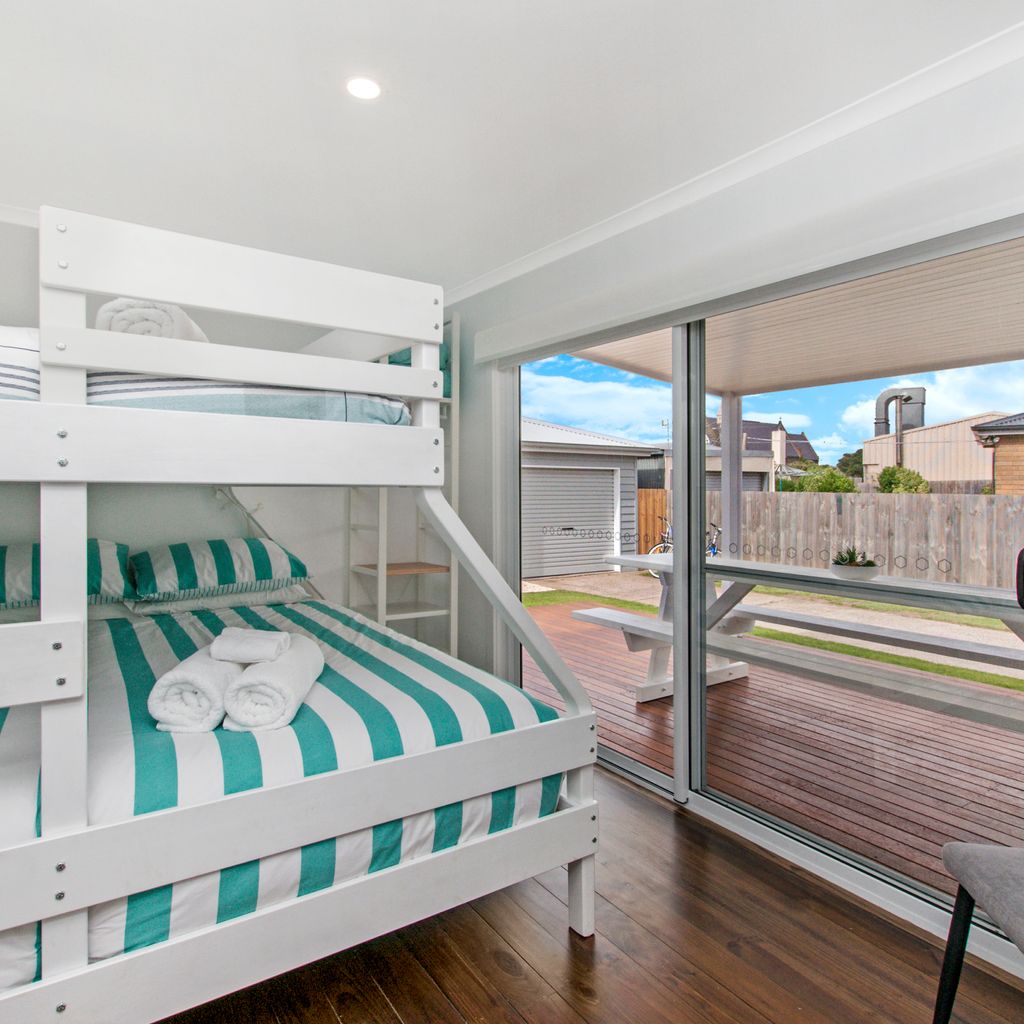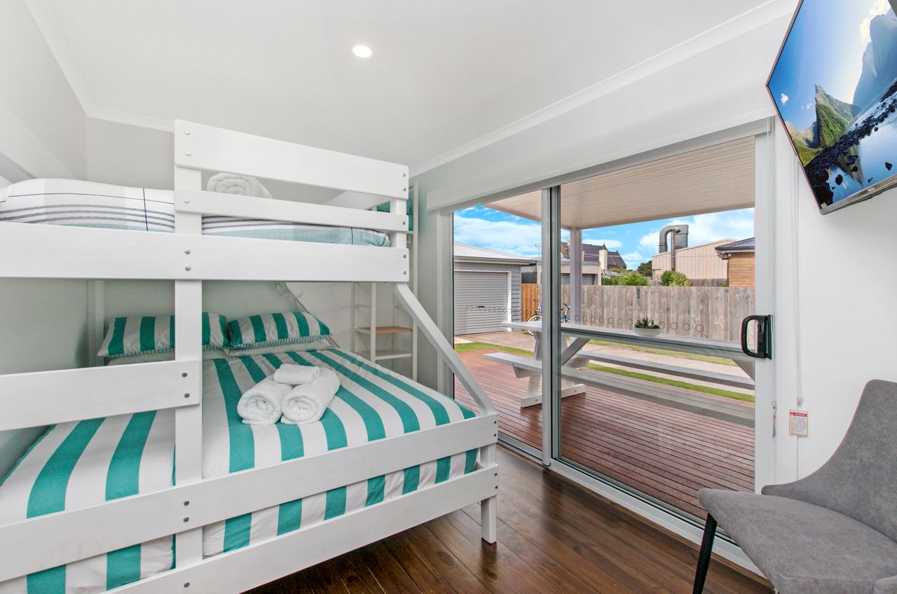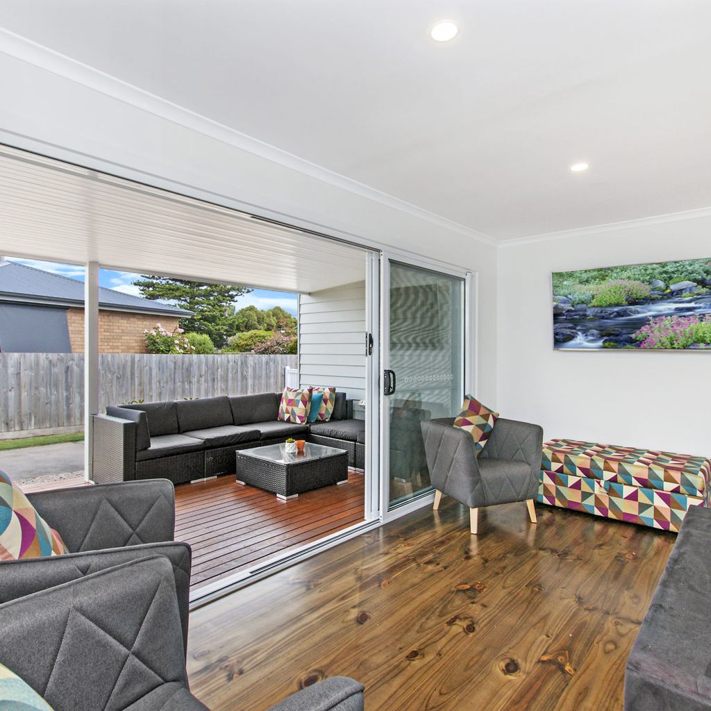 The main living with split system provides a relaxing space after a busy day at the beach and is open plan into the kitchen with gas log fire keeping you toasty in winter. The kitchen has everything you could need for your time away. There is also a filtered rain water tap in the kitchen for anyone not enjoying the unique Port Fairy water taste.