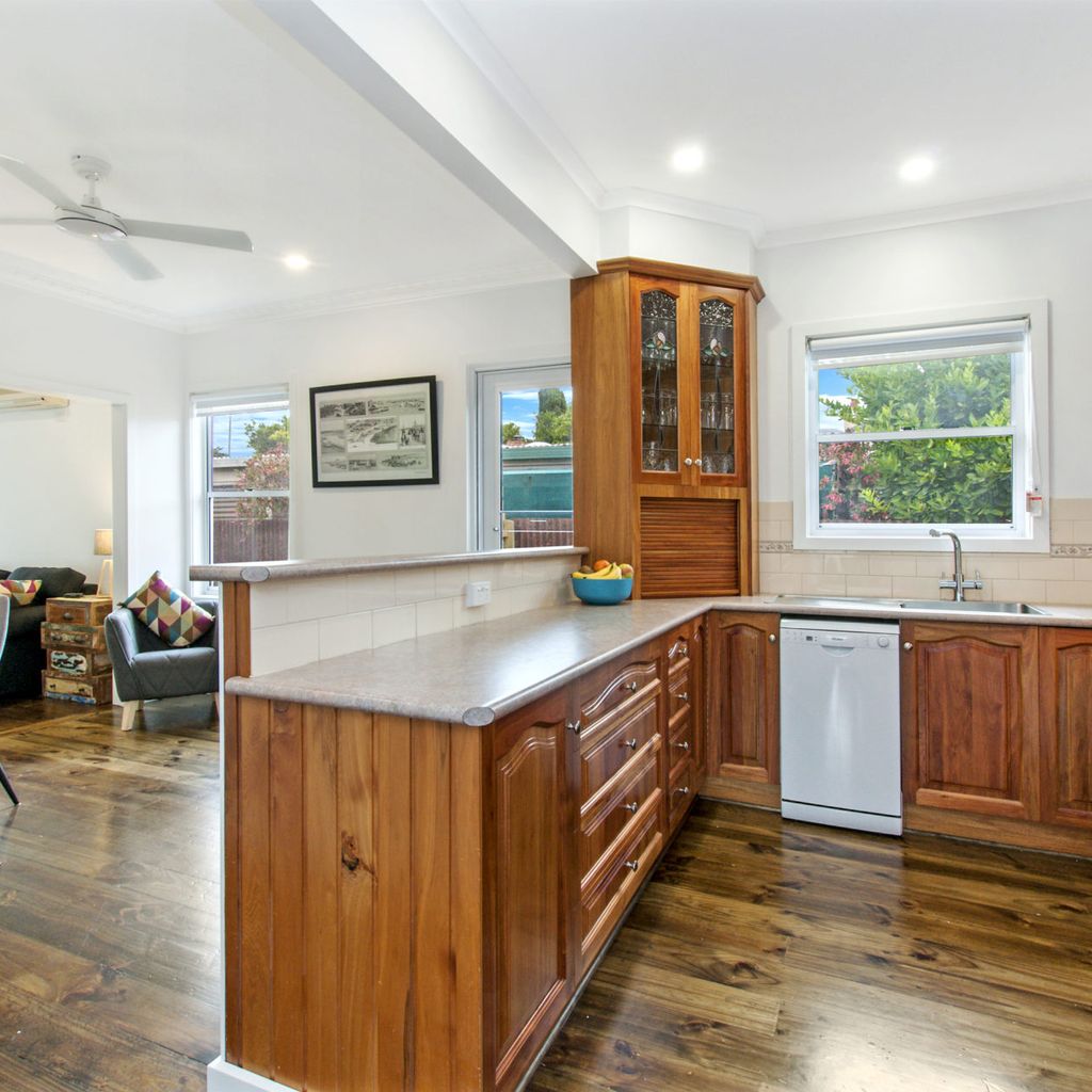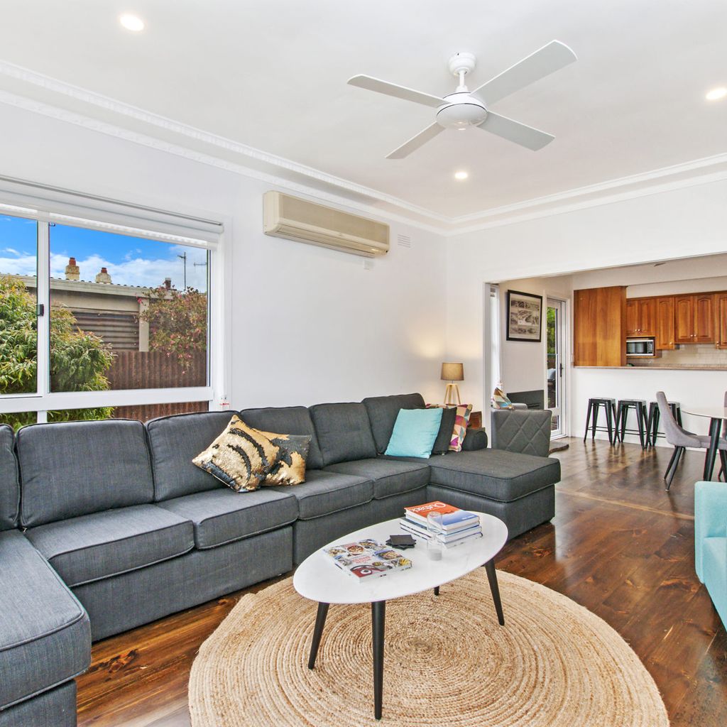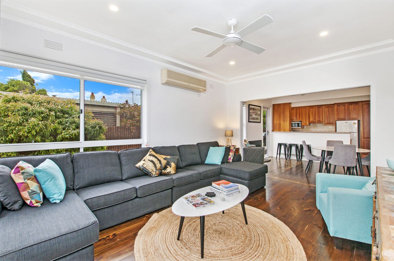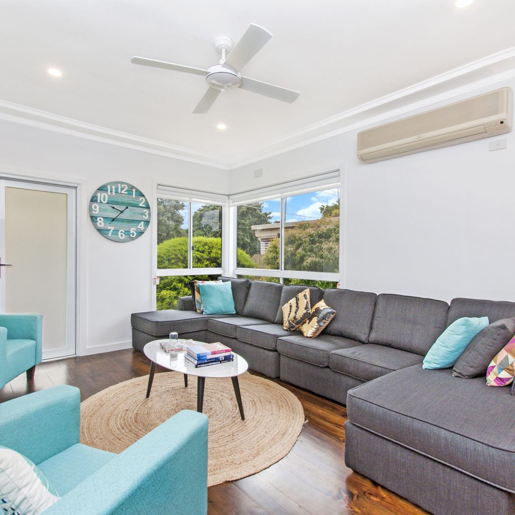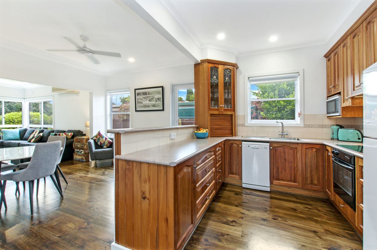 The main living with split system provides a relaxing space after a busy day at the beach and is open plan into the kitchen with gas log fire keeping you toasty in winter. The kitchen has everything you could need for your time away. There is also a filtered rain water tap in the kitchen for anyone not enjoying the unique Port Fairy water taste.