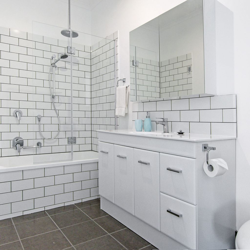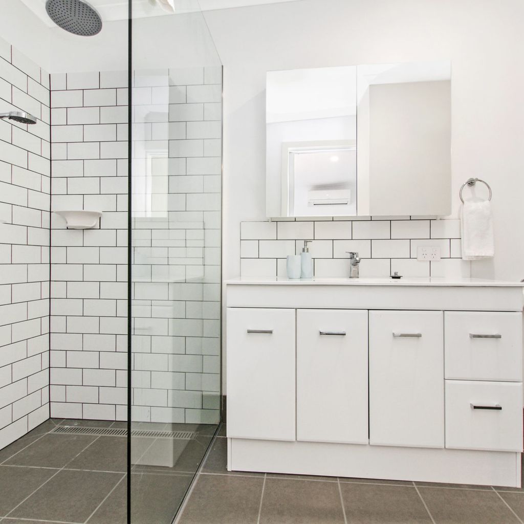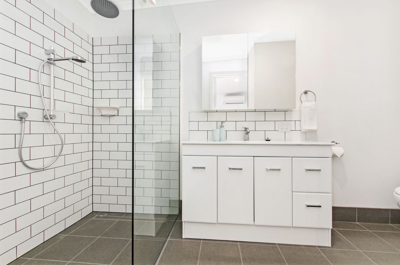 Park multiple cars on the driveway and head inside. At the front of the house there is a king bed with TV which is serviced by a bathroom with toilet, vanity and shower/bath combo.