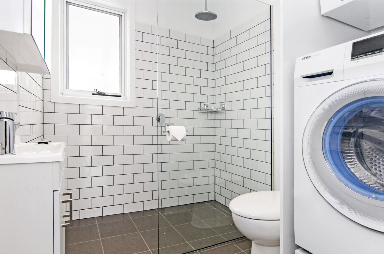 From the kitchen the house leads into the second living space, with armchairs and a TV. Ideal for popping the kids to decompress after a busy day. The second bathroom with walk in shower and toilet can be found here with the laundry that has both washer and dryer.